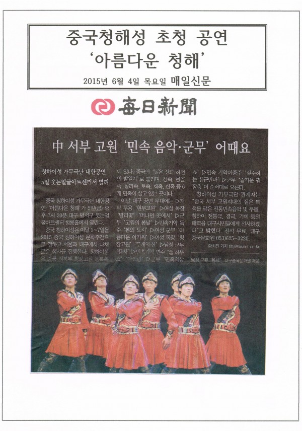 2015.06.04 매일신문) 중국청해성 초청 공연 페이지 정보 작성자 중국문화원 작성일15-06-11 09:38 조회2,526회 댓글0건 이전글 다음글 본문 - 댓글목록 등록된 댓글이 없습니다. 이전글 다음글